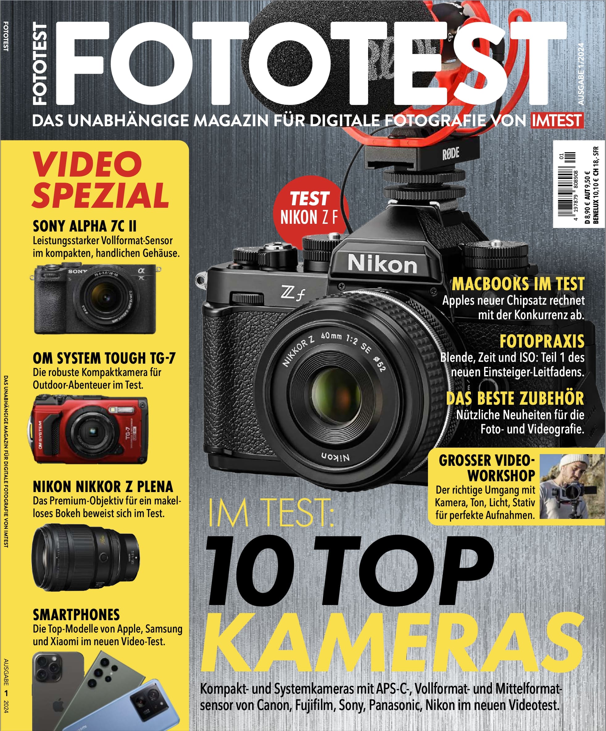 6 Frohes neues Jahr Die spannenden Neuheiten zum Jahres beginn von Canon,Sony,Leica und mehr auf einen Blick. VIDEO 10 Das Video in der Hauptrolle Das Titel thema dieser Ausgabe steht im Rampen licht. Das ist für den Video dreh wichtig. 13 So testet FOTOTEST Das neue Test verfahren zur Prüfung der Videoqualität von Kameras und Smartphones erklärt. 14 Sony RX100 VII Noch handlicher geht es kaum: DieKompakt kamera zeigt jetz tihre Videoqualitäten. 16 Canon Powershot G7 X Mark III Mit der richtigen Ausstattung und hoherVideoqualität eine gute Wahl für Vlogger. 18 Canon EOS R7 Die All zweck waffe für moderne Content-Erzeugung 20 Nikon Z fc Die Nikon Zfc im Retro-Look und mit APS-C-Sensor im neuen Video-Prüf verfahren. 22 Sony Alpha 6700 Sony setzt mehr und mehr auf Video funktionalität. So auch bei diesem starken APS-C-Modell im Test. 24 Panasonic Lumix S5II Die Vollformat-Kamera punktet mit tollem Preis-Leistungs-Verhältnis und guter Video ausstattung. 26 Canon EOS R5 C Die Kamera für kino reife Film drehs fühlt sich in Profi-Händen am wohlsten.DerTestzeigt,wieso. 28 Nikon Z 8 Das neue Testverfahren zeigt, wieso nicht nur die Fotoqualität von Nikons Spitzen modell überzeugt. 30 Sony Alpha 7R V Sonys Alphatier mit Vollformat-Sensor mit 6 1Megapixeln im neuen Video-estverfahren. 32 Fujifilm GFX100 II Großer Mittelformat-Sensor und enorme Videofunktionalität: Fujifilms Profi Werkzeug im Test. 34 Apple iPhone 15 Pro Das Premium-Modell der neuesten Serie im Test: Wie gut dreht das iPhone 15 Pro Videos? 36 Samsung Galaxy S23 Ultra Ein Jahr alt und noch immer konkurrenzlos: Wiedas S23 Ultra sich auch bestens für das Filmen eignet. 38 Xiaomi 13T Pro Das Flaggschiff mit 8K-Auflösung und vielen Video-Extras kostet weniger als seine Konkurrenten. |